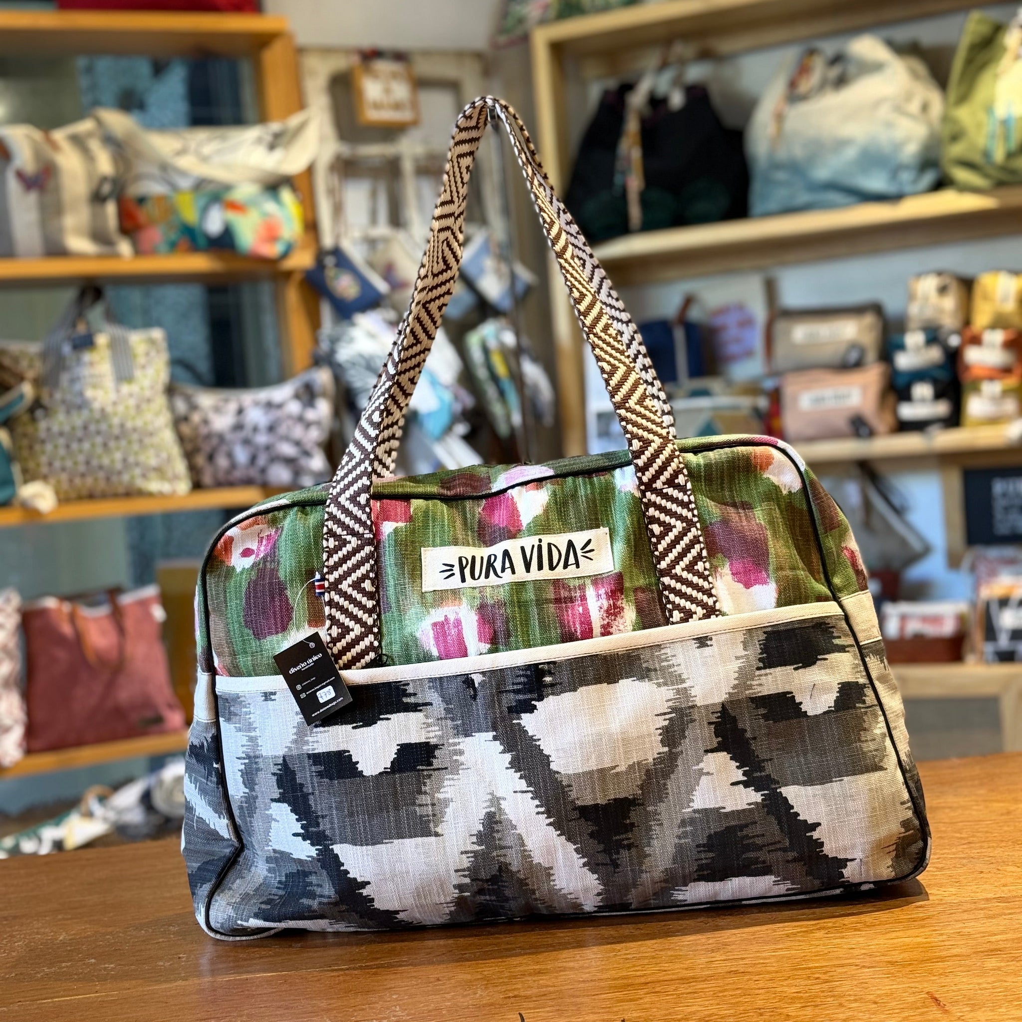 Este bolso de viaje es especialmente resistente y liviano. Está fabricado con material de calidad para asegurar su durabilidad. Caracterizado por el diseño único, no hay dos iguales. Cuenta con varios bolsillos externos para mayor organización, y manijas largas y cómodas para un transporte confortable.