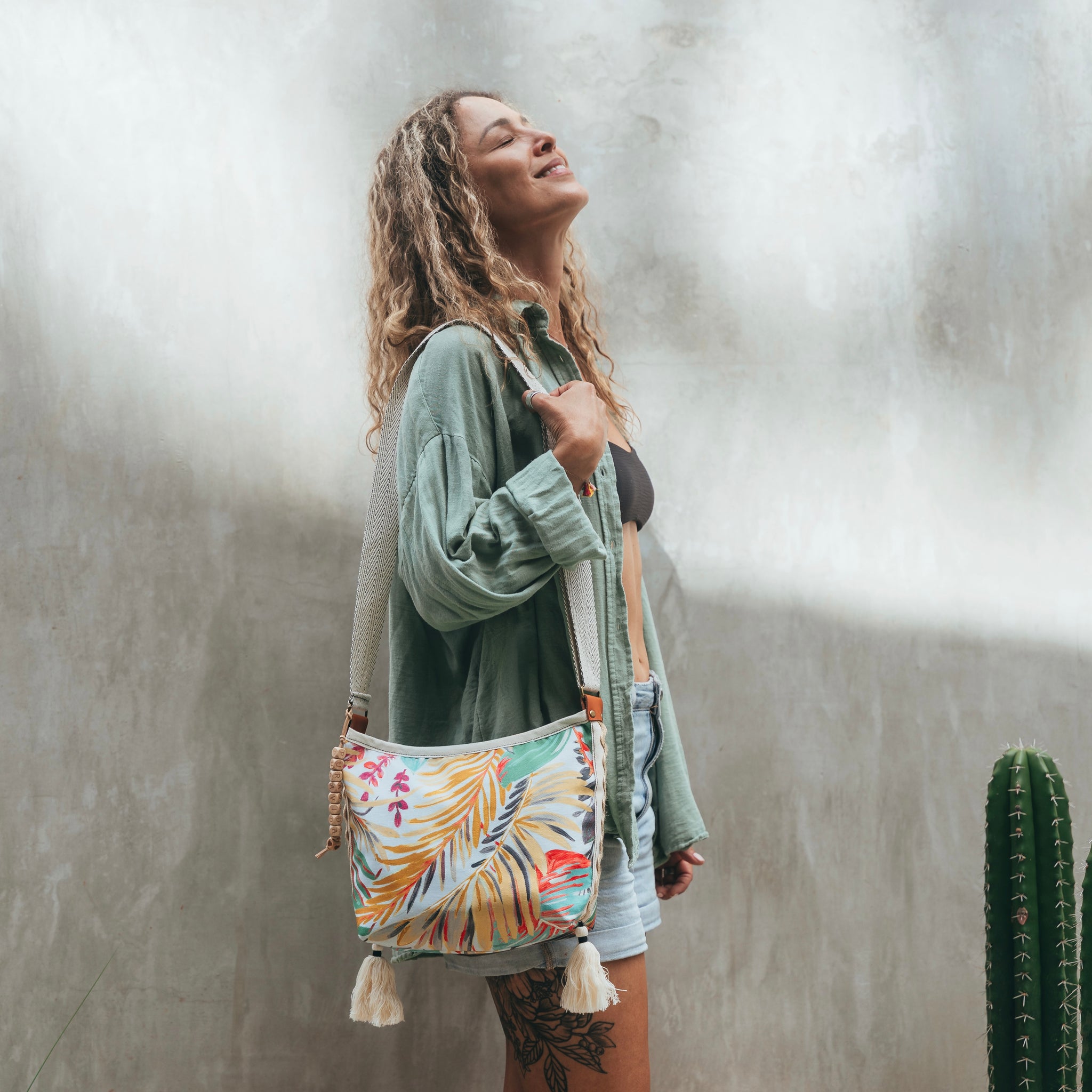 Small bag made of printed tapestry fabric, waterproof lining, jute appliqué on the sides, handmade cotton tassels. And the perfect detail: a wooden pendant that says "PURA VIDA"