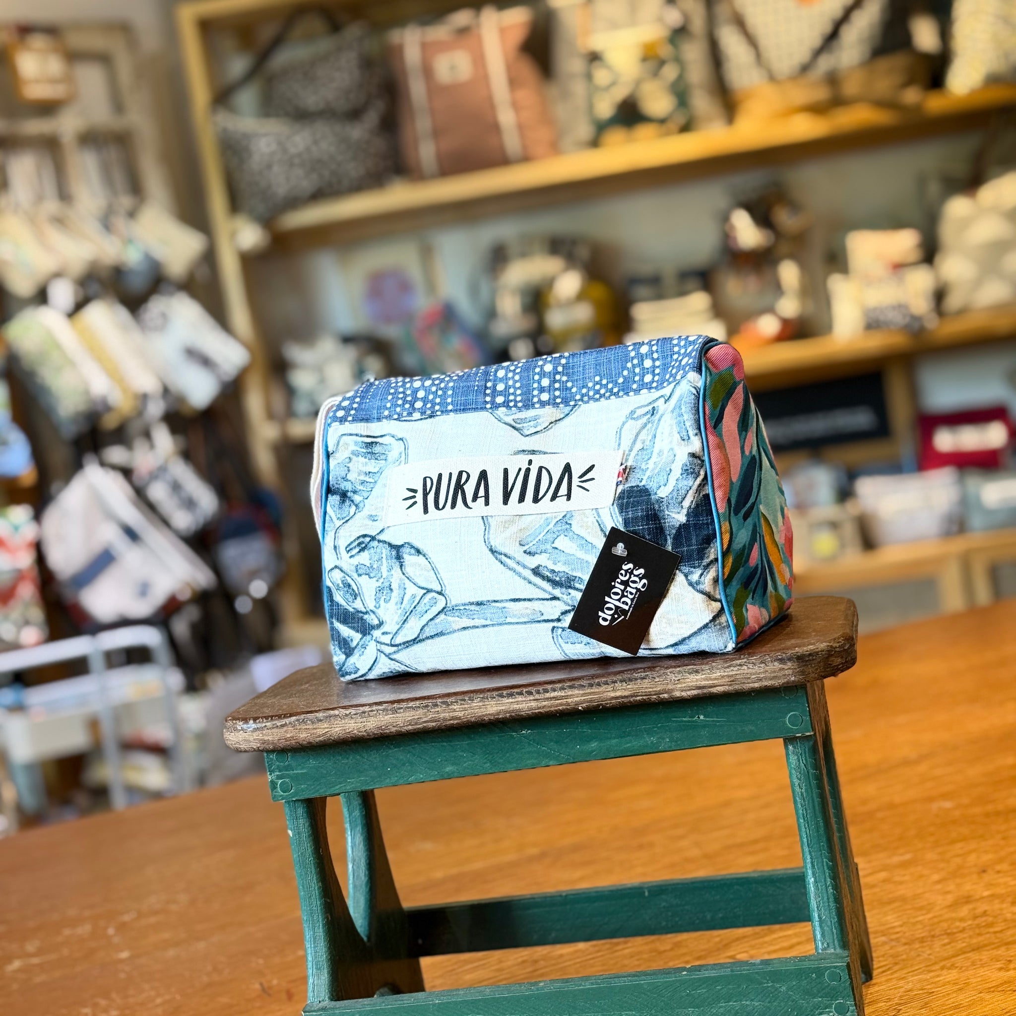 Cosmetiquera Salva, es un regalo ideal para aquellos que buscan algo único e irrepetible. Hecho a mano con telas combinadas, bolsito de mano, cosmetiquera super amplia, con forro de algodón y manija de algodón para la comodidad.